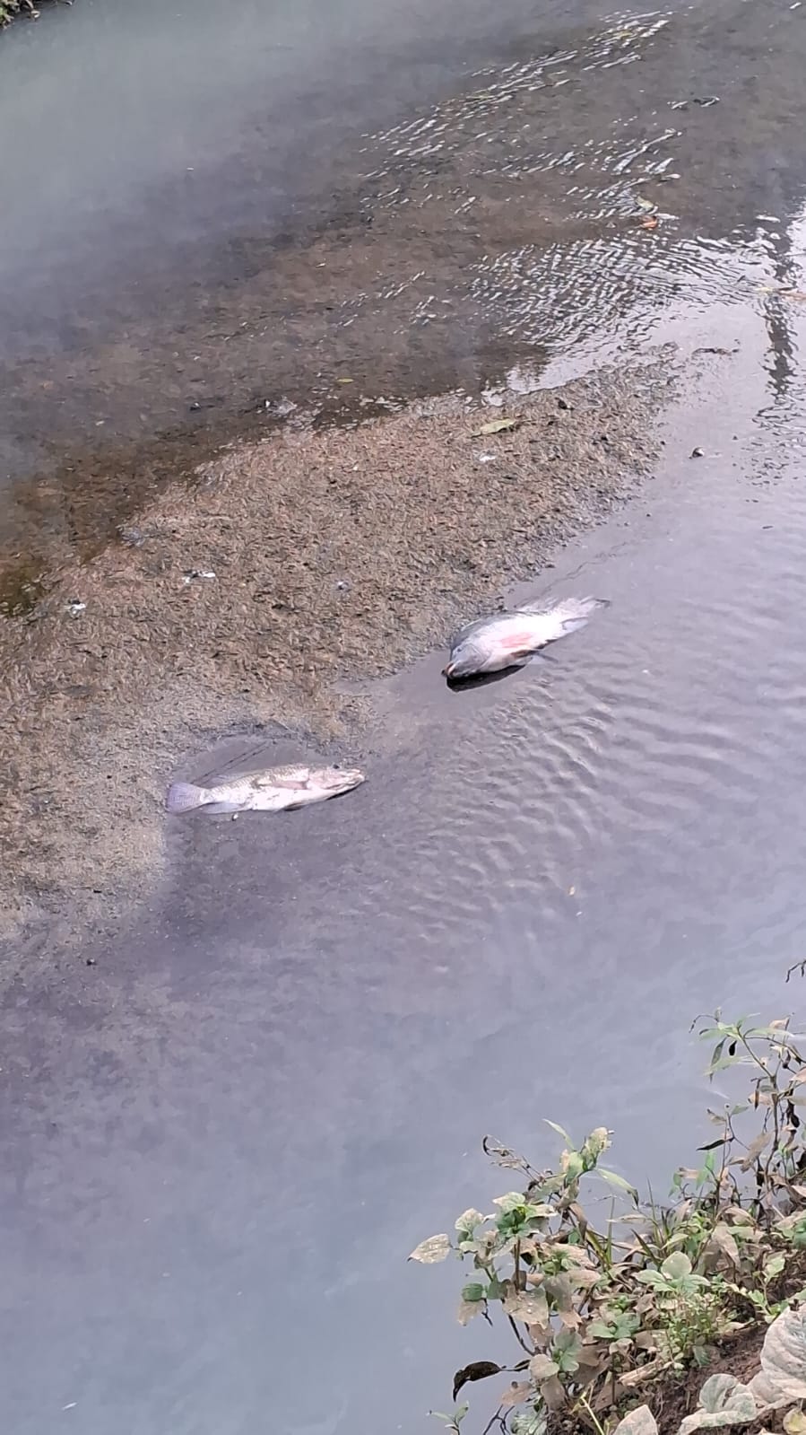 Água turva e peixes mortos foram vistos em um afluente do rio Cachoeira, no bairro América, na tarde deste domingo. .