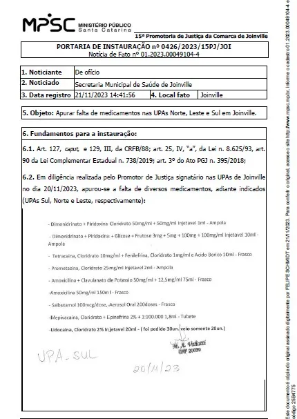Na última segunda-feira (20), o promotor do MPSC – 15ª Promotoria de Justiça da Comarca de Joinville – Felipe Schmidt, notificou a Secretaria de Saúde de Joinville pela falta de medicamentos básicos nas três UPA’s da cidade. Foi dado um prazo de até 15 dias para que a prefeitura responda. Veja: